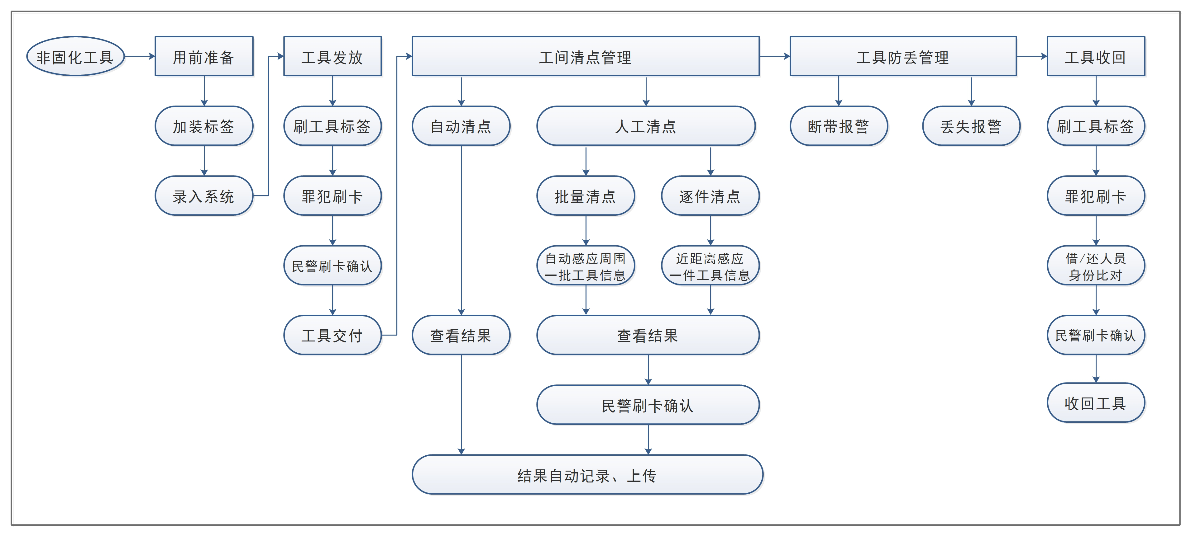 本次項(xiàng)目擬建設(shè)一套勞動(dòng)工具管理系統(tǒng),并通過本系統(tǒng)與人工管理的結(jié)合實(shí)現(xiàn)嚴(yán)格的勞動(dòng)工具管理。系統(tǒng)從勞動(dòng)工具的發(fā)放至工具的回收,提供全流程的管理方案。同時(shí),方案重點(diǎn)針對(duì)工具數(shù)量多、分布較為分散的實(shí)際給出智能化的管理方法,有效防范工具丟失的情況發(fā)生。系統(tǒng)通過降低管理過程中的人工參與,在減輕民警工作負(fù)擔(dān)的情況下實(shí)現(xiàn)工具的嚴(yán)格管理。