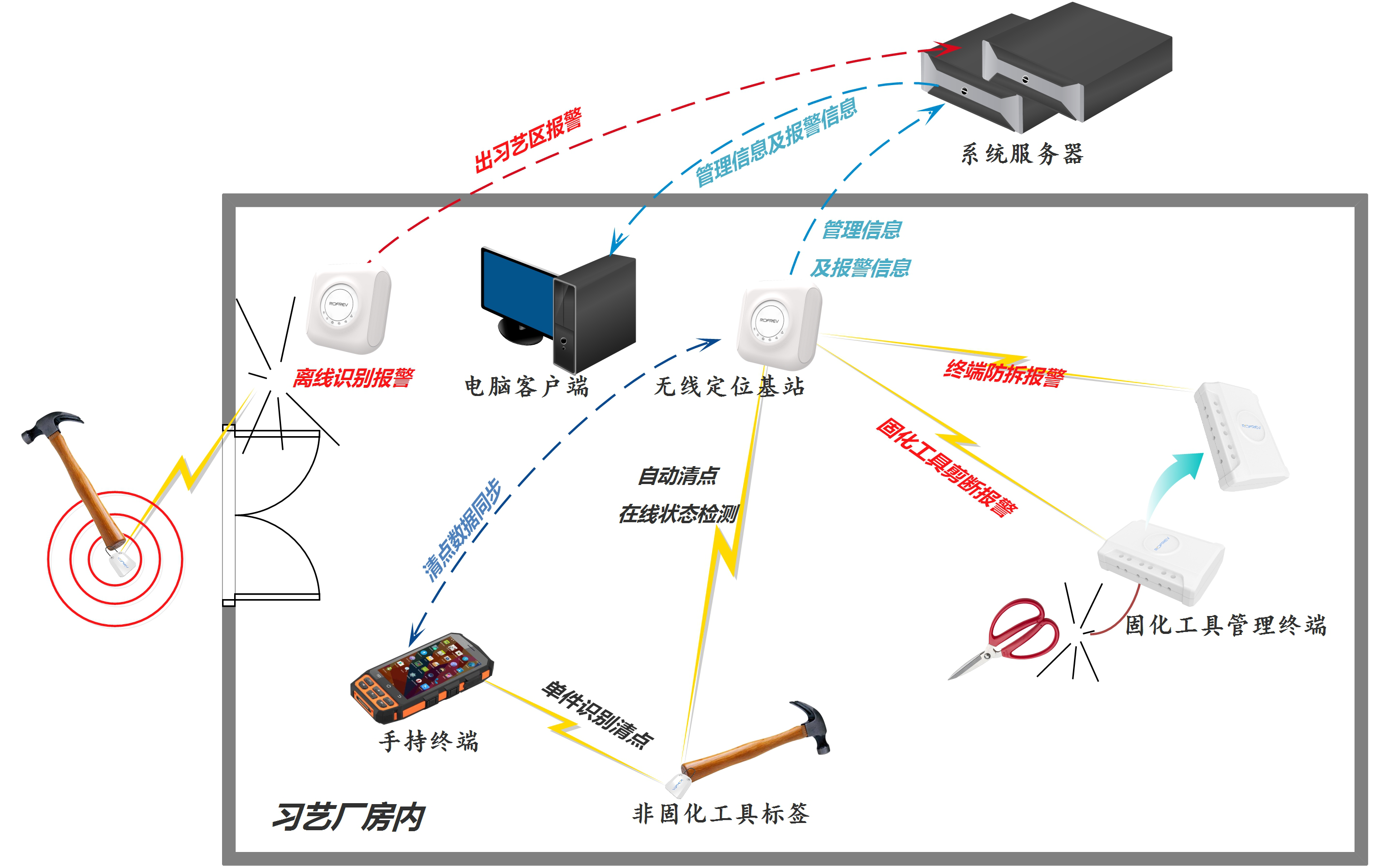 非固化工具的有源工具標(biāo)簽定時(shí)向系統(tǒng)發(fā)回?zé)o線信號(hào),如將工具帶離習(xí)藝區(qū),則系統(tǒng)將無(wú)法持續(xù)接收到有源工具標(biāo)簽的信號(hào),從而自動(dòng)發(fā)出無(wú)線報(bào)警信號(hào)。
